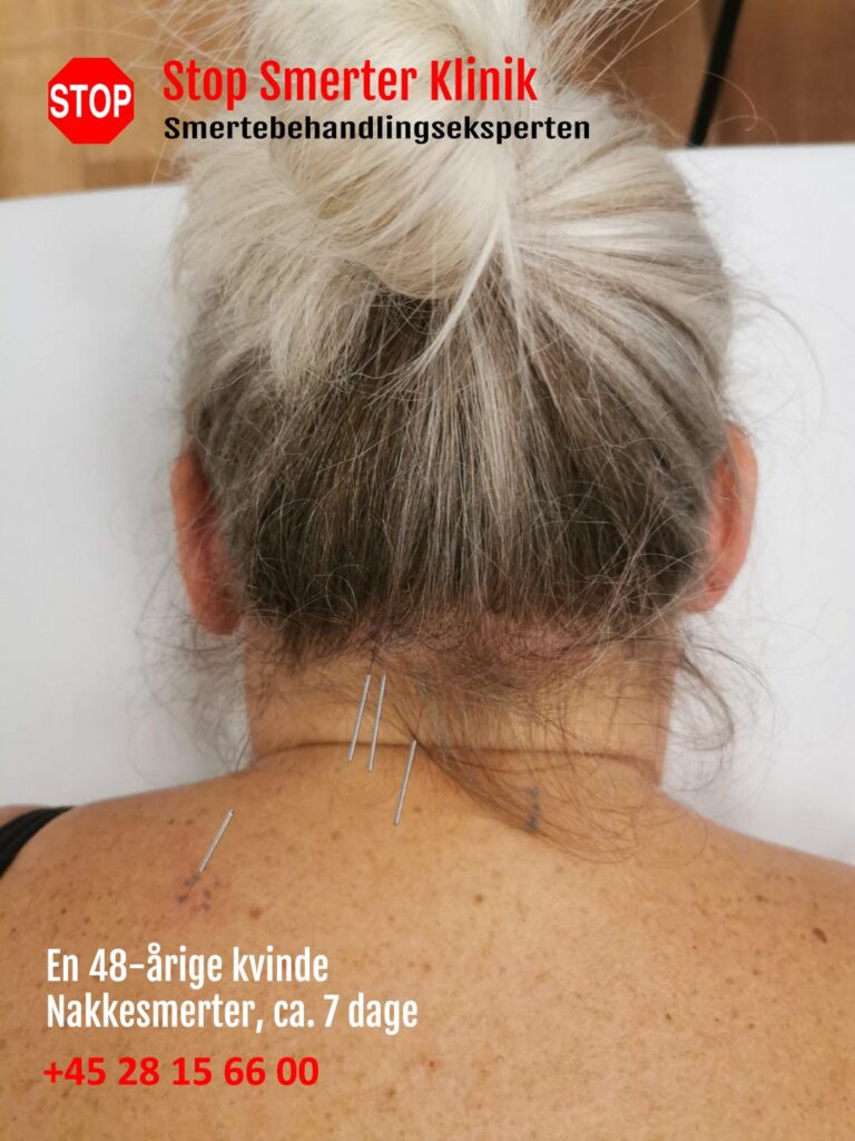 4, Dette er den anden akupunkturbehandling. Hendes nakkesmerter er næsten helet.